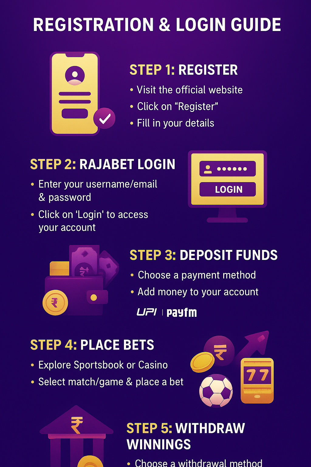 Learn how to register, complete your Rajabet login, deposit funds, and start betting on sports or casino games. Discover the full guide with tips for secure play and easy withdrawals.